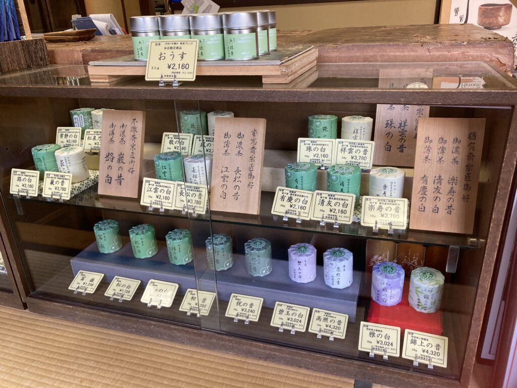 特別挽上の「錦上の昔」(約3,780円)、定番の「峰の白」(約1,836円)などの高級な銘柄から日常使いの番茶まで、幅広い価格帯と予算に対応した茶のラインナップ。誰もが訪れやすく、誰かに贈りたくなる、心配りあふれる品揃えです。